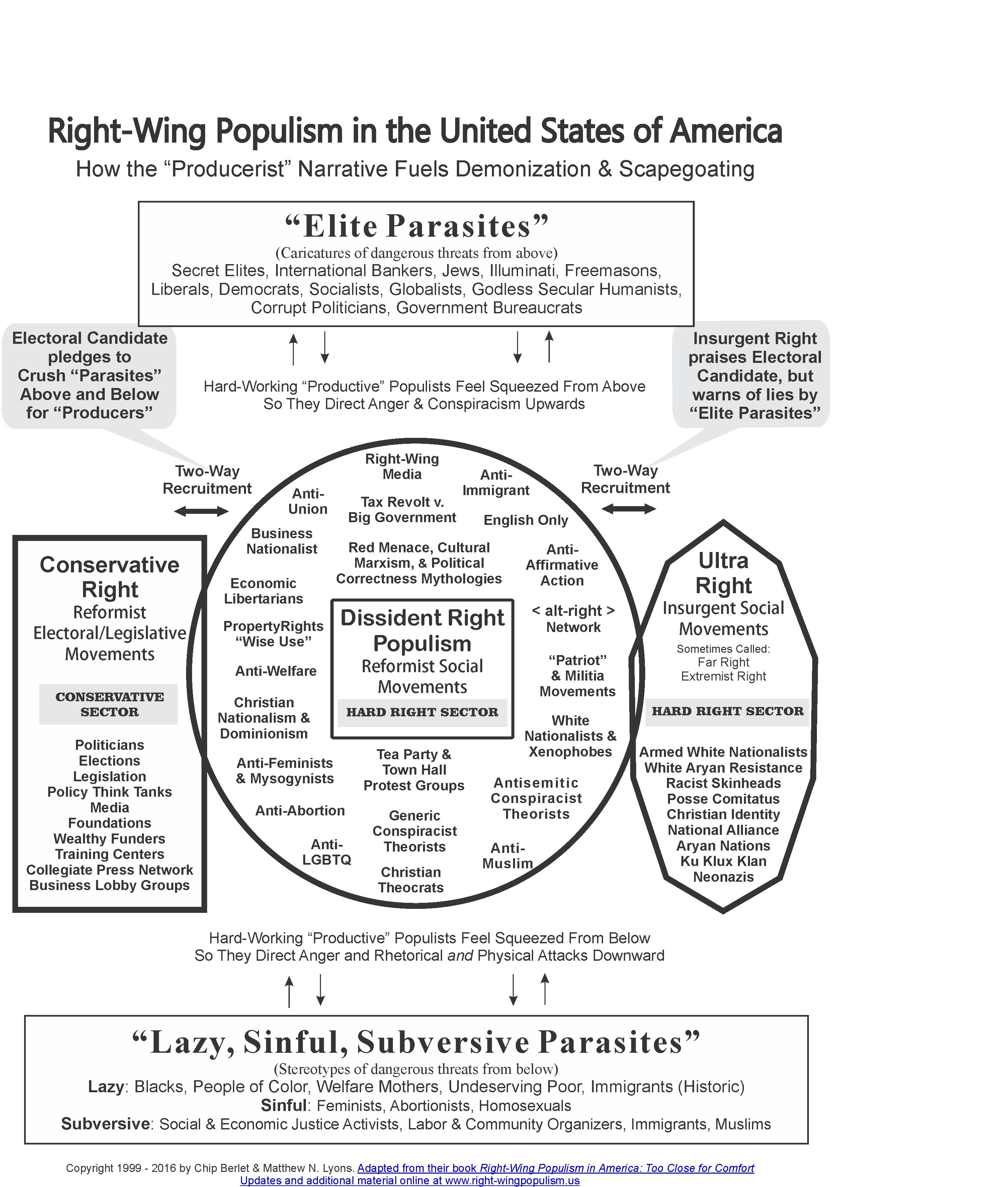 Alright, but the SPLC is known for its inflation of the white supremacist threat, which is fundamental to its business model. What about experts like Berlet? Actually, I think Berlet’s work is interesting here in illustrating precisely the problem. He knows more about far-right groups than probably anyone else in the United States. The trouble is that he’s not very interested in carefully and neutrally evaluating the question of how worried we should be about them. Berlet’s work tends to downplay statistical questions and emphasize ideological ones. (If you don’t believe me, read it for yourself.) When he does include charts and diagrams, they tend to look like this: