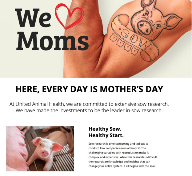 This campaign was created by the Indiana-based company United Animal Health, whose name is itself a euphemism. As an “animal science” research firm, its mission is to “create value for livestock producers.” In the pork industry, “sow research” means engineering female pigs to give birth to as many viable piglets as possible throughout their lives. Each mother pig on a typical factory farm is immobilized in a tiny cage, artificially inseminated, and forced to give birth to litter after litter of baby pigs, who are promptly taken away and slaughtered at about six months old.