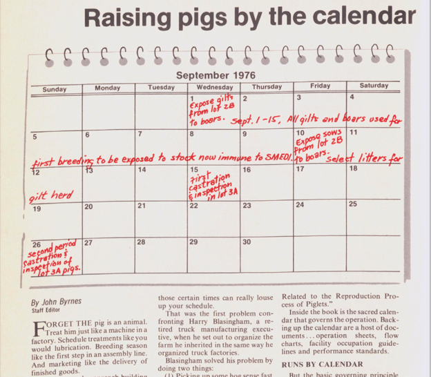 - “Forget the pig is an animal—treat him just like a machine in a factory,” recommended Hog Farm Management in 1976.