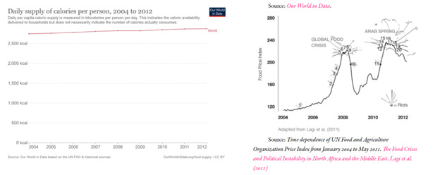 The chart on the left shows the steady global supply of calories per person, which bears no relation to the rollercoaster ride of food commodity prices on the right.
