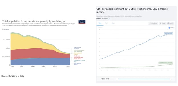 The truth here is that the improvement in extreme poverty levels—the metric so beloved by progress-cheering elites and which is shown on the left below—is nothing more than, as I have stated before, a tiny fig leaf barely concealing an ugly truth. The data couldn’t be clearer: the GDP per capita gap between rich and poor nations, as shown by the figure below on the right, is growing, not shrinking.