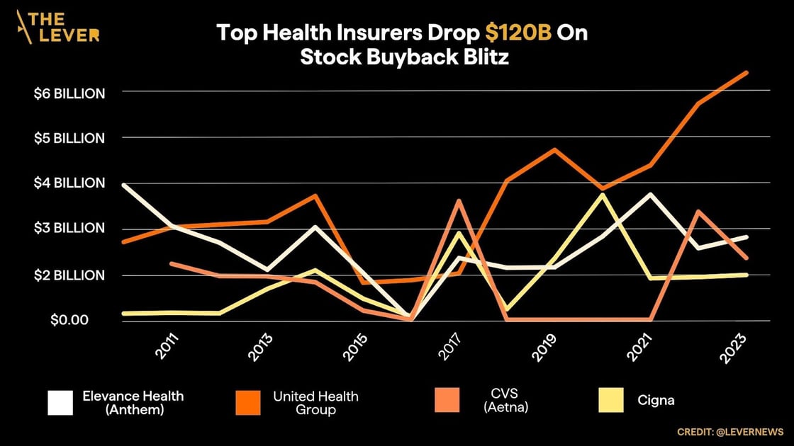 ❧ According to an investigation bythe Lever,health insurance companies have spent more than $120 billion since 2010—money that could have gone towards covering insurance claims—on stock buybacks that enrich top executives and shareholders. Meanwhile, one in three Americans are struggling with medical debt and nearly a quarter say they’ve avoided seeking healthcare due to the cost. The worst offender, if you can believe it, is good ol’ UnitedHealth, which has more than doubled its stock buyback spending since 2010 while denying more claims than other insurers. Why are people mad at these guys? Who’s to say…