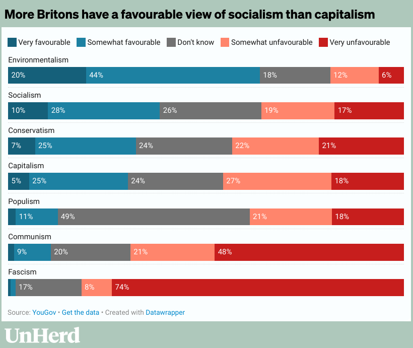 ❧ A new YouGov poll on the approval rating of various “isms” shows that people in the U.K. prefer socialism (which has 38 percent in favor) to capitalism (which came in at 30 percent). Fascism ranked dead last with only 1.9 percent support, and we certainly hope that was because people kept slipping and hitting the wrong button. (UnHerd)