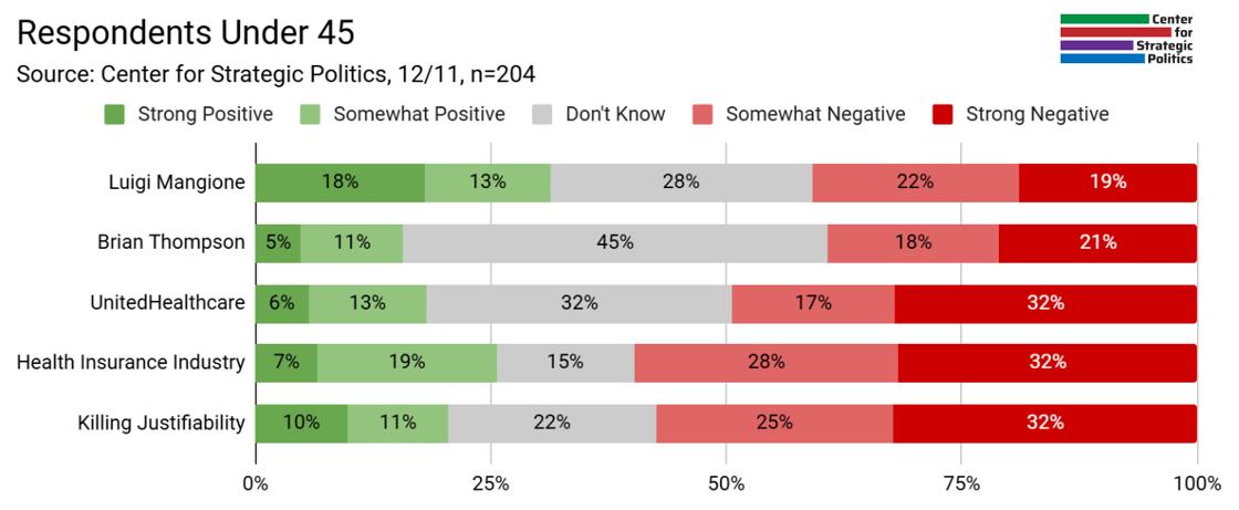 ❧ The corporate media are not handling the Luigi Mangione story well. We now have the first official survey about the accused shooter’s public approval rating, and it shows that although people dislike murder generally, roughly “31% of U.S. adults under 45” have a positive view of Mangione—significantly higher than the group that has anything good to say about UnitedHealth CEO Brian Thompson (16 percent) or the health insurance industry as a whole (26 percent.)