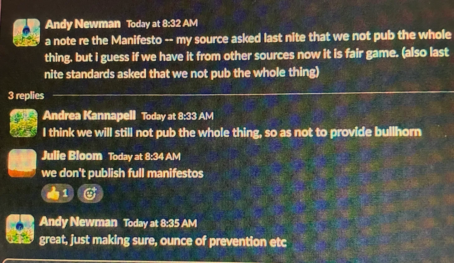 The Times has also been suppressing information and images that it believes could lead people to conclusions it doesn’t want them to make. As independent journalist Ken Klippenstein points out, they refuse to print Mangione’s full manifesto (even though it’s quite short), and leaked internal messages from editor Andrea Kannapell say this is “so as not to provide bullhorn.” (No issue with providing a “bullhorn” to UnitedHealth, apparently.)
