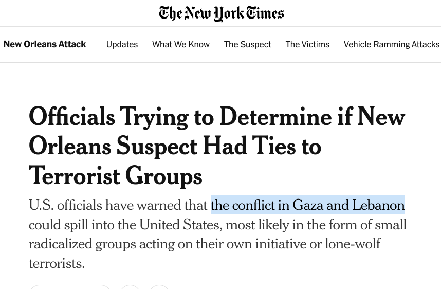 A special shout-out goes to New York Times national security correspondent Eric Schmitt, who decided to imply the New Orleans attack was related to “the conflict in Gaza and Lebanon” on the basis of… absolutely nothing. What a colossally irresponsible thing to do!