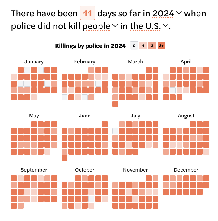 ❧ U.S. police killed a record number of people in 2024, with at least 1,356 deaths according to data from Mapping Police Violence. That’s approximately 3.71 killings per day, and there were only 11 days in the entire year when police did not kill anyone—more evidence that cops are a threat to our safety, not protectors of it, and need to be seriously reined in.