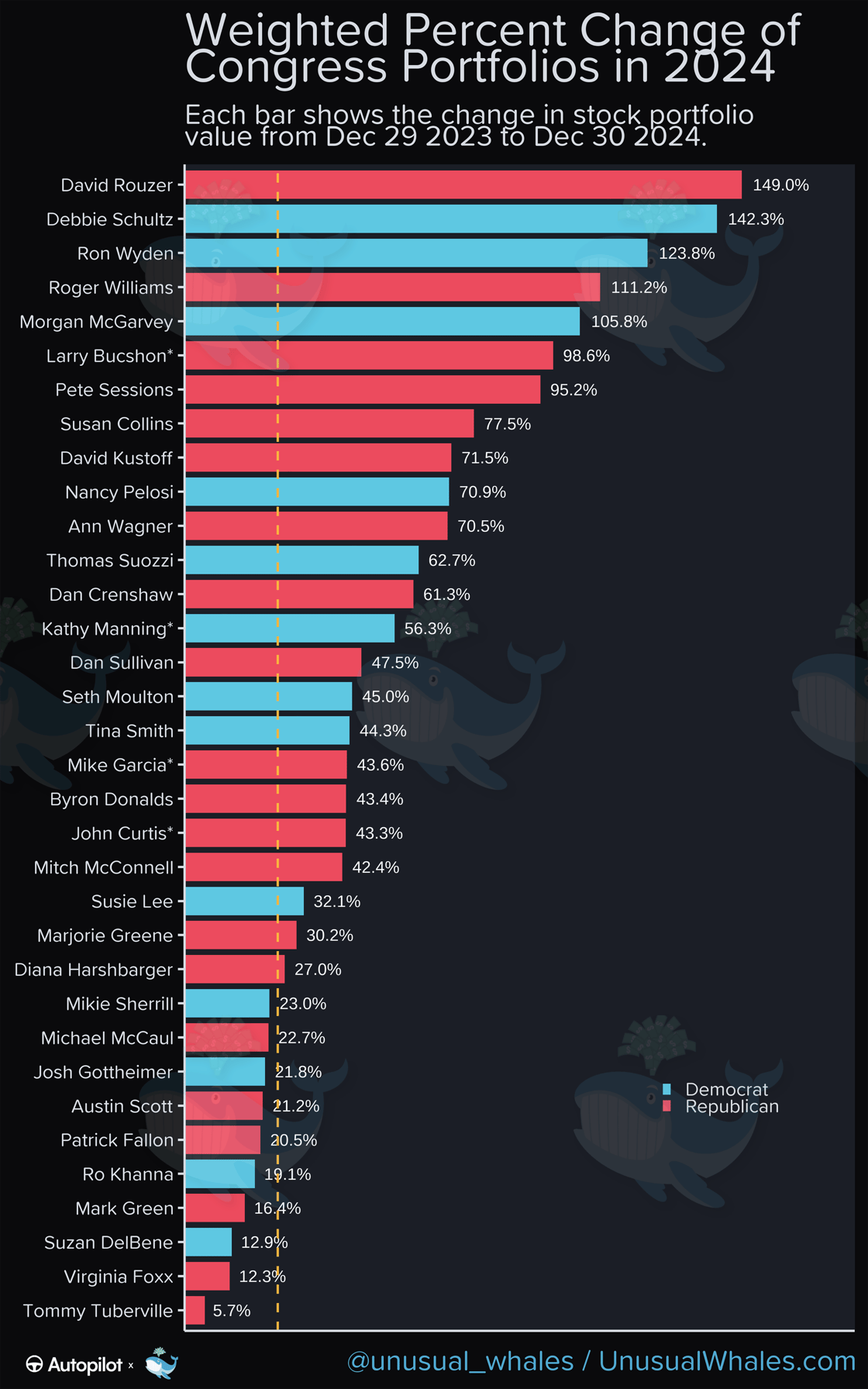 ❧ The financial website Unusual Whales just released its annual report on Congress members’ stock holdings and transactions. Like every year since the reports started in 2020, our elected leaders did significantly better than market averages, with both Democrats and Republicans outperforming the SPY ETF (which tracks the S&P 500 companies as a group):