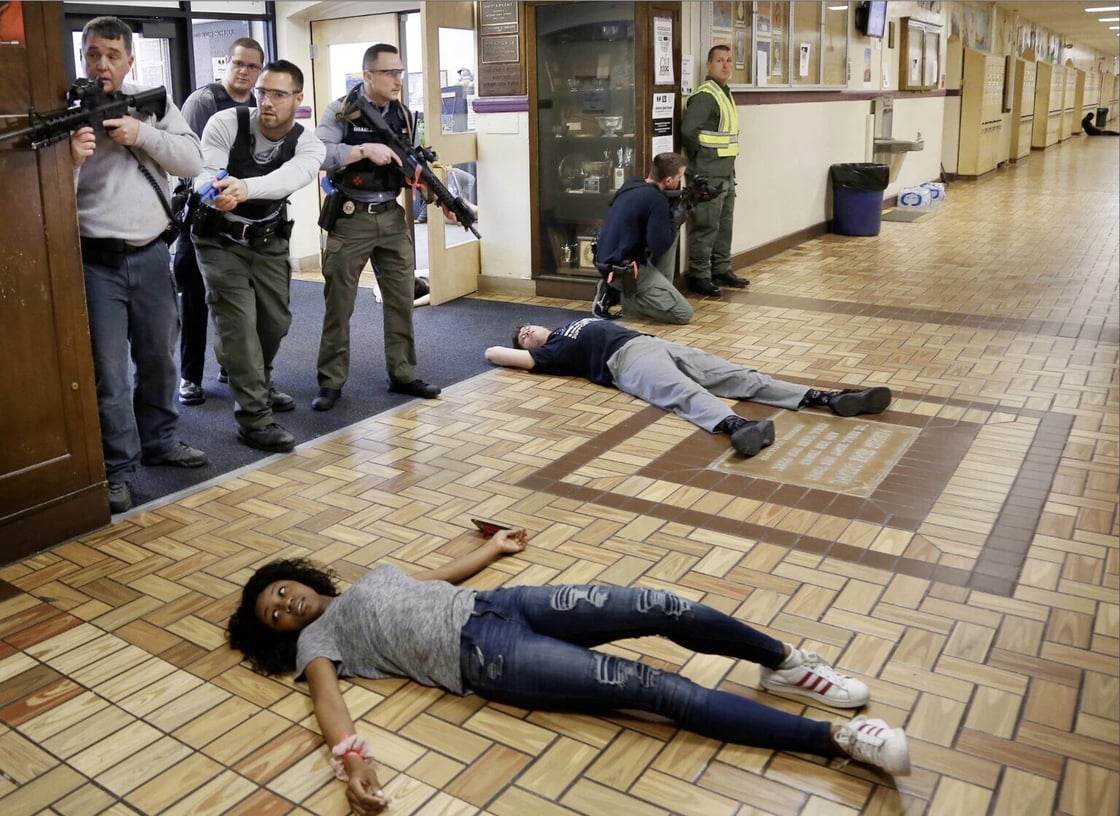 During an active shooter drill at Deering High School in Portland, MI, students lay on the floor simulating having been shot.