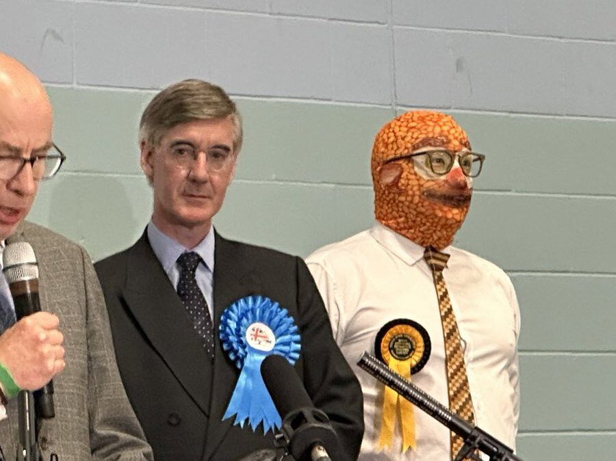 We’d be jumping for joy at Rees-Mogg’s defeat if we weren’t so distracted by the guy standing next to him. In case you’re wondering who this bean-faced interloper is, he’s a joke candidate from theMonster Raving Loony Partycalled Phin “Barmy Brunch” Adams. (Photo: Tom Noble, Twitter)