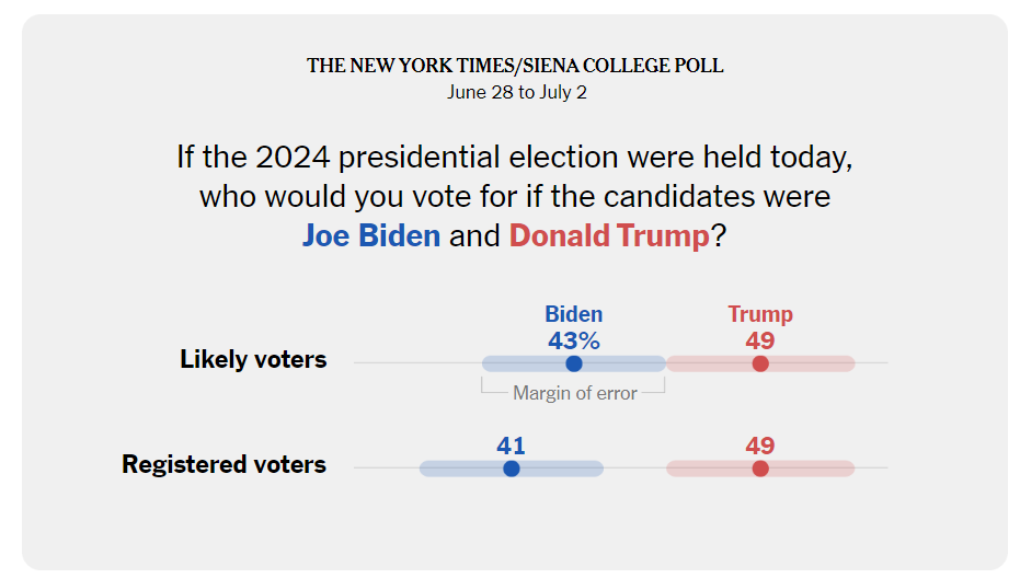 ❧ The Joe Biden situation keeps getting worse. It’s now been over a week since the disastrous June 27 debate between Joe Biden and Donald Trump, and the fallout just keeps coming. A new batch of post-debate polls have come out, and Politico reportsthat they put Biden in “the worst electoral shape of the 2024 election.” The New York Times/Siena Collegepollhas Trump leading by six points among likely voters (49 percent to 43), and by nine points among registered voters (49 to 41.)