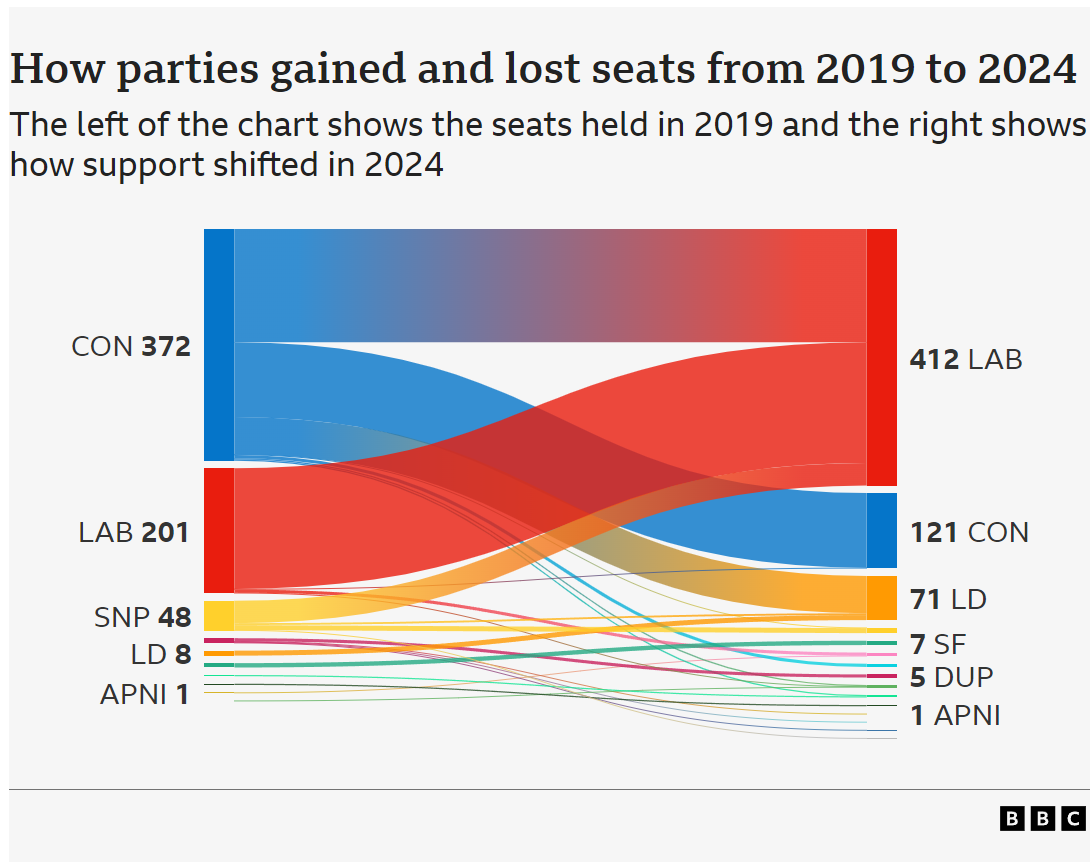 While Labour will no-doubt take this victory as a validation of its centrist turn, it is quite a hollow one when examined more closely. This election saw just 60 percent turnout, the lowest engagement since 2001. And the absolute number of votes for Labour was actually lower than in 2019, when they were still helmed by Corbyn and soundly defeated by the Conservatives. BBC pollster John Curtice said “All in all this looks more like an election the Conservatives lost than one Labour won.” Third parties also took sizable bites from the Tory carcass, including the centrist technocrat Liberal Democrats and the far-right psycho Reform UK. (Its leader, Nigel Farage, is heading to Parliament for the first time, God help us).