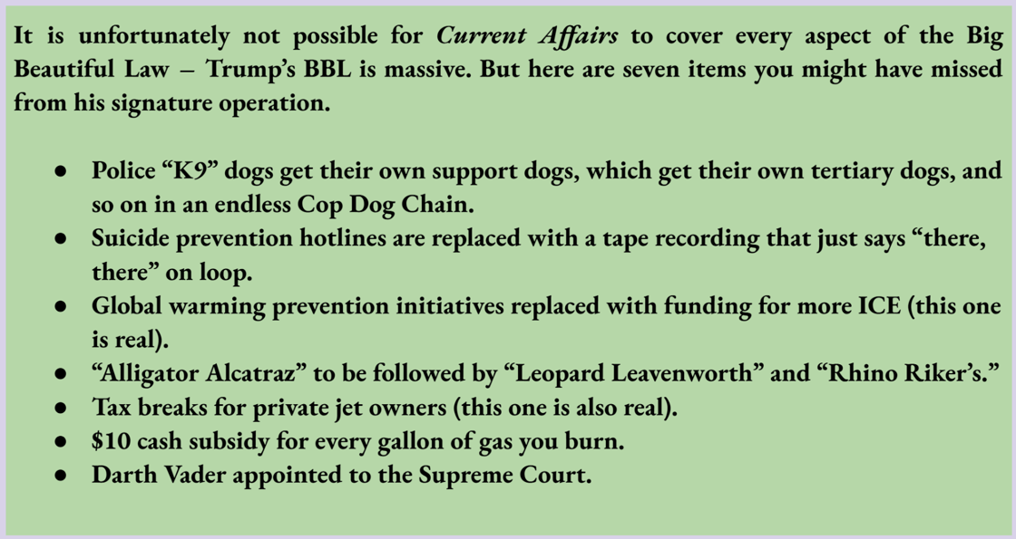 Writing and research by Grady Martin. Editing and additional material by Nathan J. Robinson and Alex Skopic. Header graphic by Cali Traina Blume. This news briefing is a product of Current Affairs Magazine. Subscribe to our gorgeous and informative print edition here, and our delightful podcast here.