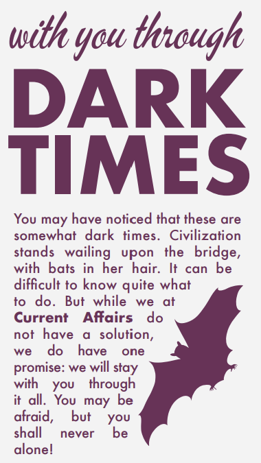 Current Affairs is an independent leftist media organization supported entirely by its readers and listeners. We offer a beautiful bimonthly print and digital magazine, a weekly podcast, and a regular news briefing service. We are registered with the Internal Revenue Service as a 501(c)(3) nonprofit organization with EIN 83-1675720. Your gift is tax-deductible to the extent allowed by law. Donations may be made through our website, via wire transfer, or by sending us a check. Email help@currentaffairs.org with any questions.