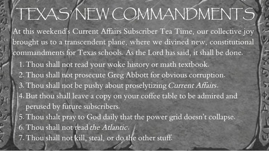 In related news, on Friday, the day before Texas’ law was enacted, a federal court struck down a similar law in Louisiana. The state of Louisiana plans to appeal its case to the Supreme Court if necessary, where the law is not on their side. The Supreme Court ruled in 1980 that putting the Ten Commandments in classrooms violates students’ constitutional rights. By placing a religious text at the head of the classroom (a specific sect’s interpretation of a religious text, no less), the government promotes an establishment of religion. Thank God the Supreme Court doesn’t have a history of overruling 50 year old precedents—Republicans in at least 15 other states have proposed similar commandment laws. In the meantime, educators and public servants should feel free to reference Current Affairs' guide to navigating Louisiana's law.