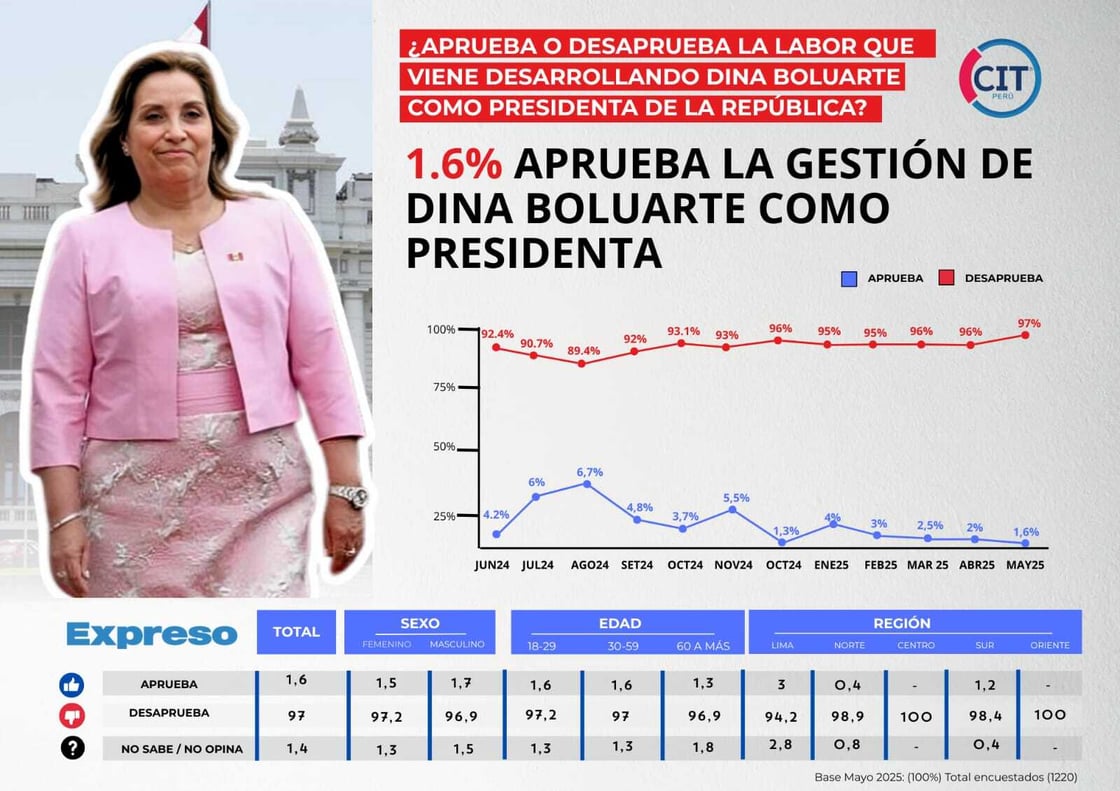 ❧ Just about everybody hates Peru’s right-wing president, Dina Boluarte. According to a survey published this weekend by the Peruvian polling firm CIT Opinión, Boularte received just 1.6 percent approval across the nation and more than 97 percent disapproval. Some of this revulsion stems from her personal conduct, which has included allegedly accepting gold Rolex watches as bribes and taking unannounced time off from being president to get cosmetic surgery. But more consequential has been her total fealty to the world’s oligarchs: Launching a DOGE-esque “deregulatory shock” and offering up the nation’s natural resources to multinational conglomerates. And in response to protests, the military has carried out extreme, indiscriminate violence, which multiple human rights groups have called crimes against humanity.