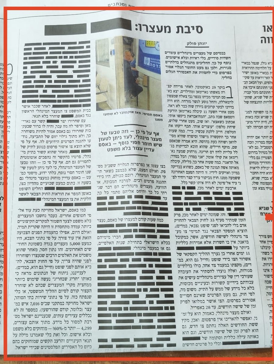 The Israeli government is requiring the censorship of press discussing the nation’s “administrative detention” system, which holds of Palestinians indefinitely without trial or charge (Al Jazeera). In a powerful statement, the newspaper Haaretz sent an op-ed about the subject to print looking like this (Haaretz):