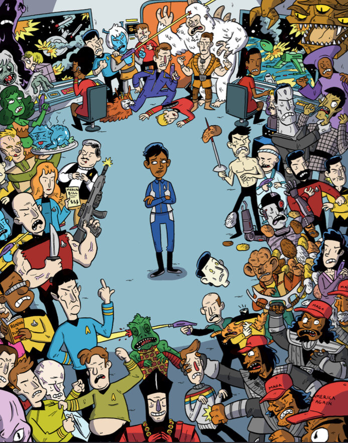 This last part—Trek’s utopianism—is likely the key to its continuing prominence. Modern media fandom really began with Star Trek: in the 60s and 70s, Trekkies, mostly female Trekkies, created fanzines and the first real pop culture conventions. People liked the Star Trek universe created by Gene Roddenberry so much that they wanted to live in it, or barring that, talk about it constantly with people who understood why the camaraderie of multicultural nerds in space meant so much to them. The fans fought to keep the original series from being cancelled (and failed); and yet the show remained popular in syndication, and has since spawned thirteen movies and five more TV shows: The Next Generation, Deep Space Nine, Voyager, Enterprise—and now, in 2017-2018, Discovery, a show so odd, so off-putting, so vicious and violent and militaristic that it seems like an invader from another universe entirely.