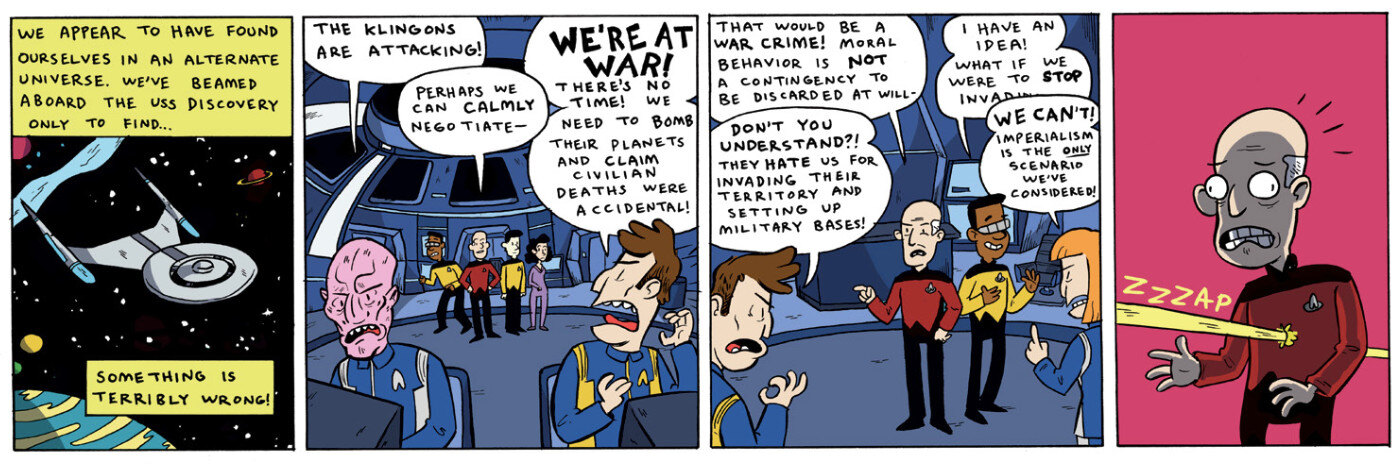 Okay, okay: so even if you’re not a Star Trek geek who’s angry at seeing a unique and beloved fictional universe mutated into a lifeless Prestige TV dystopia, why should Discovery make you mad, or at least a little disappointed? In a previous article for Current Affairs, I surveyed a number of popular speculative fictions and pointed out how much of contemporary sci-fi and fantasy relies on a “lesser of two evils” narrative. It’s not important to really do good, or be good; you just have to behave a little better than the other guys, whether they’re a horde of ice zombies, Nazi wizards, or plain old psychotic terrorists. This is the ideology of the mainstream Democratic party: stand for nothing, believe in nothing, because after all “have you seen the other guys?” Star Trek: Discovery might have been written by the DNC. Burnham’s speech about values is full of empty, easy platitudes; her real, bigoted attitude and her willingness to embrace high-handed regime change can be glossed over, because she and the rest of the cast are sufficiently diverse. I’ve watched and read a lot of science fiction, but this might be the most depressing one I’ve ever experienced: a future in which the best that can be imagined is American foreign policy repeating itself endlessly, forever.