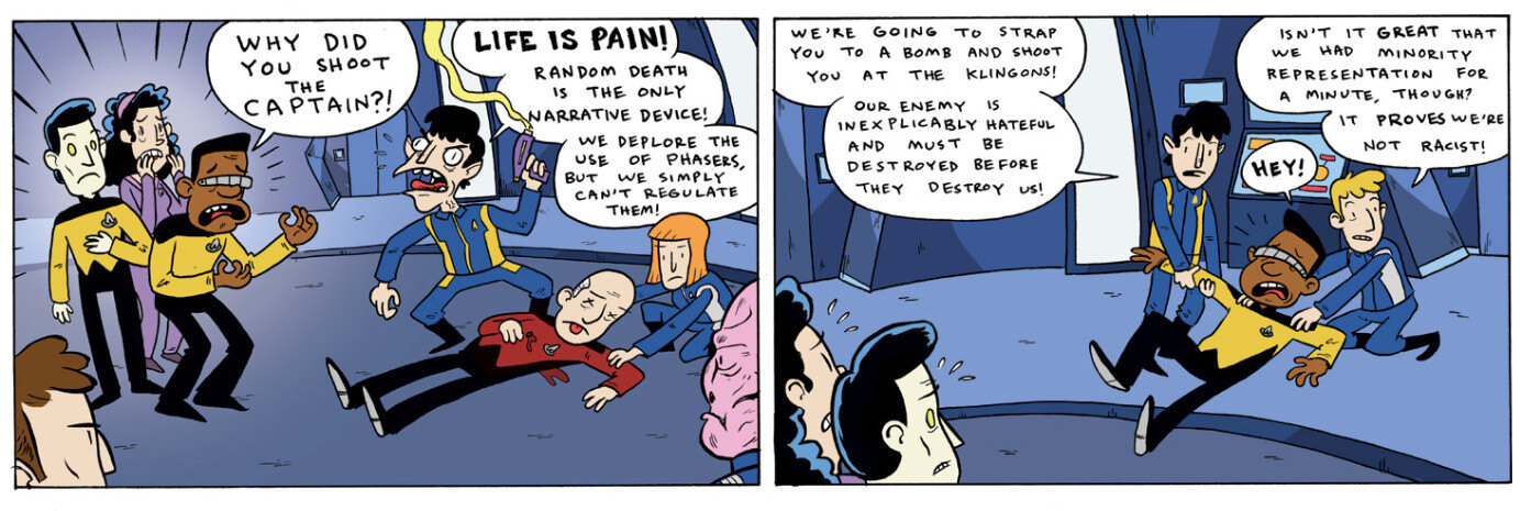 Fine, fine, so there’s lots of explosions! So the characters live in a terrifying universe of omnipresent violence! But hey, they’re a very diverse cast, and isn’t that in keeping with the spirit of Star Trek? It’s true that, in Michael Burnham, Discovery features Trek’s first black female protagonist (though they didn’t make her captain). Philippa Georgiou is the first captain who’s a woman of color (though of course, she gets killed off in the second episode). And on top of that, the Discovery writers proudly announced they would showcase the first openly gay characters in Star Trek history. Paul Stamets and Hugh Culber are a loving, if entirely neutered couple: Stamets is a brilliant, quirky scientist while his partner Culber is a passive helpmeet, utterly devoid of personality or interiority. Why even bother with gay characters if they’re just going to embody the same old heteronormative tropes? Especially the most heteronormative trope of all: the fridged lover. That’s right, Culber gets murdered for no particular reason. Every other episode of Discovery contains a pointless murder. Women of color are occasionally added to the cast only to be killed off or disappear, as if there can only be one highlander, and it’s Burnham. This is a hellishly depressing portrayal of “diversity”: a world where everyone, regardless of race, gender, or sexuality, is permitted to embody the same old oppressive roles and has a roughly equal chance of being brutally murdered in space.