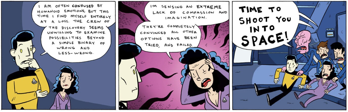 I suppose Discovery is exciting, in the way that watching endless footage of car crashes is exciting—but what it’s not is Star Trek. Roddenberry’s cheerful post-scarcity utopia, which is supposed to be just ten years down the road, is nowhere to be seen. Describing the recent history of the Federation, the sinister Captain Lorca says, “The future came, and hunger and need and want disappeared. ’Course, they’re making a comeback now.” The war with the Klingons has wrecked the Federation’s socialist economy in a few short months (curiously, this was never an issue during later shows like The Next Generation and Deep Space Nine, even though they also had occasional war plotlines). And along with the socialist economy went the high-minded ethics—suddenly, Starfleet officers are deliberately inflicting pain on other sentient beings in order to accomplish their military goals. We’ve also lost the most fun and joyful parts of Trek: the nerdy shit the characters do after work. Nobody on the starship Discovery seems to have any free time, let alone any fun. There’s exactly one party scene—in an episode with the groan-inducing title “Magic to Make the Sanest Man Go Mad”—but even that turns into a time-loop nightmare a la Groundhog Day, and the party repeatedly ends with the ship exploding in a fireball of death.