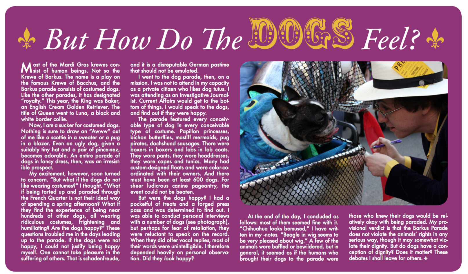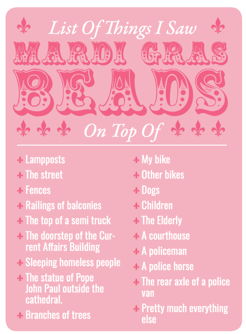 Mardi Gras did not seem like it would be my kind of holiday. It is characterized, in popular stereotypes, by three things: beads, beer, and breasts. As a teetotaler, I do not drink beer. As a person of taste, I am disinclined to cover myself in plastic beads. And while I am theoretically pro-breasts, I feel no particular need to see them publicly displayed from second-floor balconies. Making the prospect even less appealing, my apartment is in the heart of the French Quarter, a place with unpleasantly high quantities of debauchery even in the off-season. (A man peed on my house the other week.) Mardi Gras promised to be a loud, messy spectacle, the worst of New Orleans magnified and multiplied. I had friends who were leaving town to escape it. They seemed wise.