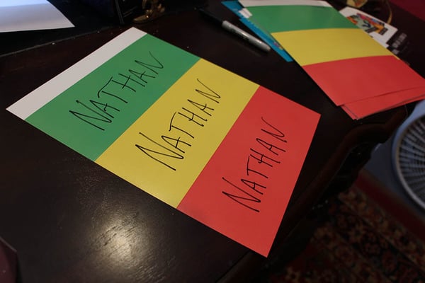 Each student gets a piece of card, which is printed in three sections, with indentations on the borders of each section to make for easy folding. The sections are red, green, and yellow. There is a little white tab on one end, so that it can be folded and stuck together with a piece of double-sided tape. Students write their names on each of the sections, as follows: