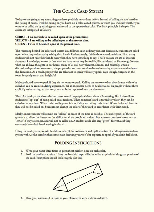 So when I started teaching, I tried to come up with a system that would have the positive features of voluntary participation (the people who don’t want to speak don’t have to speak) without the negative ones (the eager beavers dominate), and the positive features of cold-calling (bringing in reticent people, diversity of participants) without the negative ones (pants-shitting terror when the professor calls your name). The solution I devised was the color-coded card system. (I adapted it from a technique a law professor of mine, James Forman, used to use. His did not involve colors.)