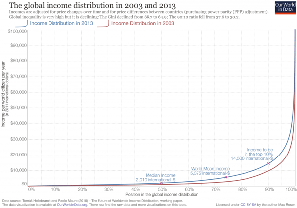 Any honest presentation of the income distribution will show that we live in a world where most people receive nearly nothing and a small number of people receive hundreds or thousands of times more. Have a look at this chart showing global income distribution in 2003 and 2013: