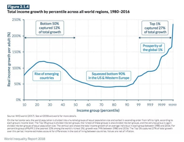 This chart is used a lot in inequality debates. It is referred to as the “elephant graph,” and credited to economist Branko Milanovic. It has been called the “hottest chart in economics.” Critics of inequality cite it to show that while the people at the very bottom and the very top are doing better and better, the people in the middle have seen much less income growth over time. But defenders of capitalism also use the chart, pointing out correctly that it shows everyone’s incomes growing. PBS’s Paul Solmon asked Milanovic about the chart, saying: