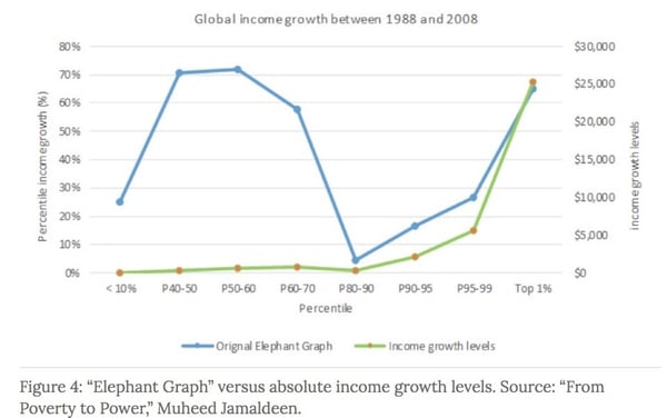 I’ve seen the elephant chart used in a classroom in a way that was suggesting, perhaps subliminally: “Hey, inequality isn’t really so bad because look how many people are benefiting from economic growth around the world. Global inequality is actually decreasing.”