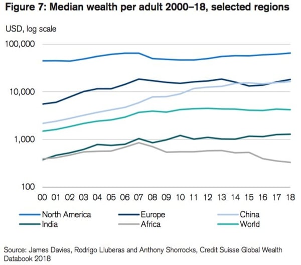 This chart disguises just how much wealth is contained in North America versus other regions. Look at the scale on the lefthand side. We go from 100 at the bottom to 1,000, then 10,000, then 100,000. On the chart, the gap between each interval is the same distance. But, of course, the difference between 100 and 1,000 is not the same as the difference between 1,000 and 10,000, or 10,000 and 100,000. The chart’s makers have used a logarithmic scale, where each interval is a multiple of the last (in this case, 10x). If we graphed this with absolute dollar amounts, the graph would look horrifying: We’d see that Africans have almost no wealth on average compared to North Americans, who have about 100x as much. (Jason Hickel has done excellent work showing how manipulative infographics are produced that disguise the true extent of global inequality. Truer representations are galling and make it very difficult to say that globalized capitalism is working out amazingly for everyone.)