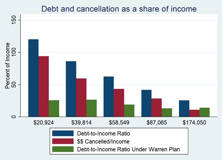 But the more important implication of these two charts is that while the total amount of outstanding debt in the population is indeed increasing as a function of income, the Warren proposal would greatly reduce the burden of student debt more for lower-income indebted households. This is especially clear in the green bars in the second chart, and the fact that debt burdens decline most for the least-well-off households. Just look at those green bars. The lowest earners go from owing more debt than their annual income to owing only about ⅕ as much as their annual income. That is, the least-well-off households get the largest relative relief, and the result is a roughly constant ratio of debt levels to income across the income distribution. Compare this to the status quo, in which the poorest borrowers are by far the most burdened.