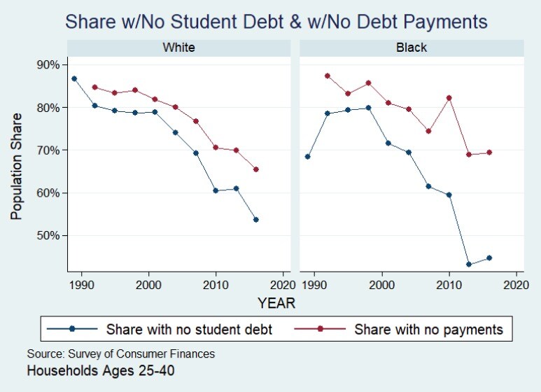 Looney rightly identifies that lower-income people make lower payments on their outstanding debt, as a share of the full cost of interest and principal repayment, than higher-income people. That is a retelling of a fact I reported in my 2018 paper on credentialization: As the share of people in the 25-40 year old age cohort without student debt has plummeted, so has the share of people who aren’t making payments on student debt—but not by nearly as much (see Figure 3). In other words, there is a growing group of people who have student debt and are not making payments on that debt in this age cohort relative to previous age cohorts. That group is disproportionately “non-traditional,” that is, from families with fewer or no college graduates, and who attended for-profit institutions.. Given the education system’s long history of discrimination and segregation, that group is, no surprise, disproportionately students of color.
