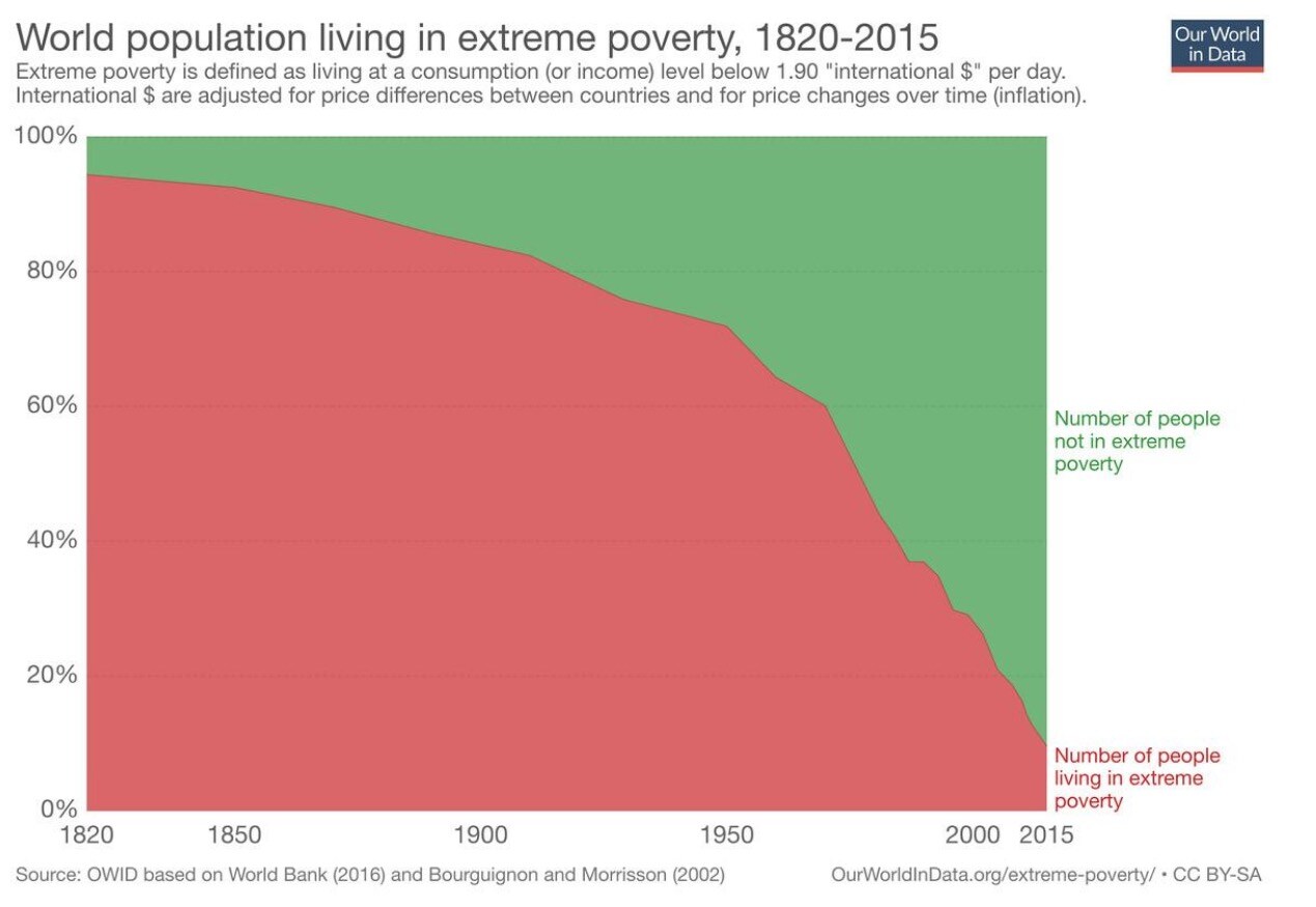In the past everything was worse. For roughly 99% of the world’s history, 99% of humanity was poor, hungry, dirty, afraid, stupid, sick and ugly … But in the last 200 years, all of that has changed. In just a fraction of the time that our species has clocked on this planet, billions of us are suddenly rich, well-nourished, clean, safe, smart, healthy, and occasionally even beautiful. Where 84% of the world’s population lived in extreme poverty in 1820, by 1981 that percentage had dropped to 44% and now, just a few decades later, it is under 10%. If this trend holds, the extreme poverty that has been an abiding feature of life will soon be eradicated for good… Welcome, in other words, to the Land of Plenty.