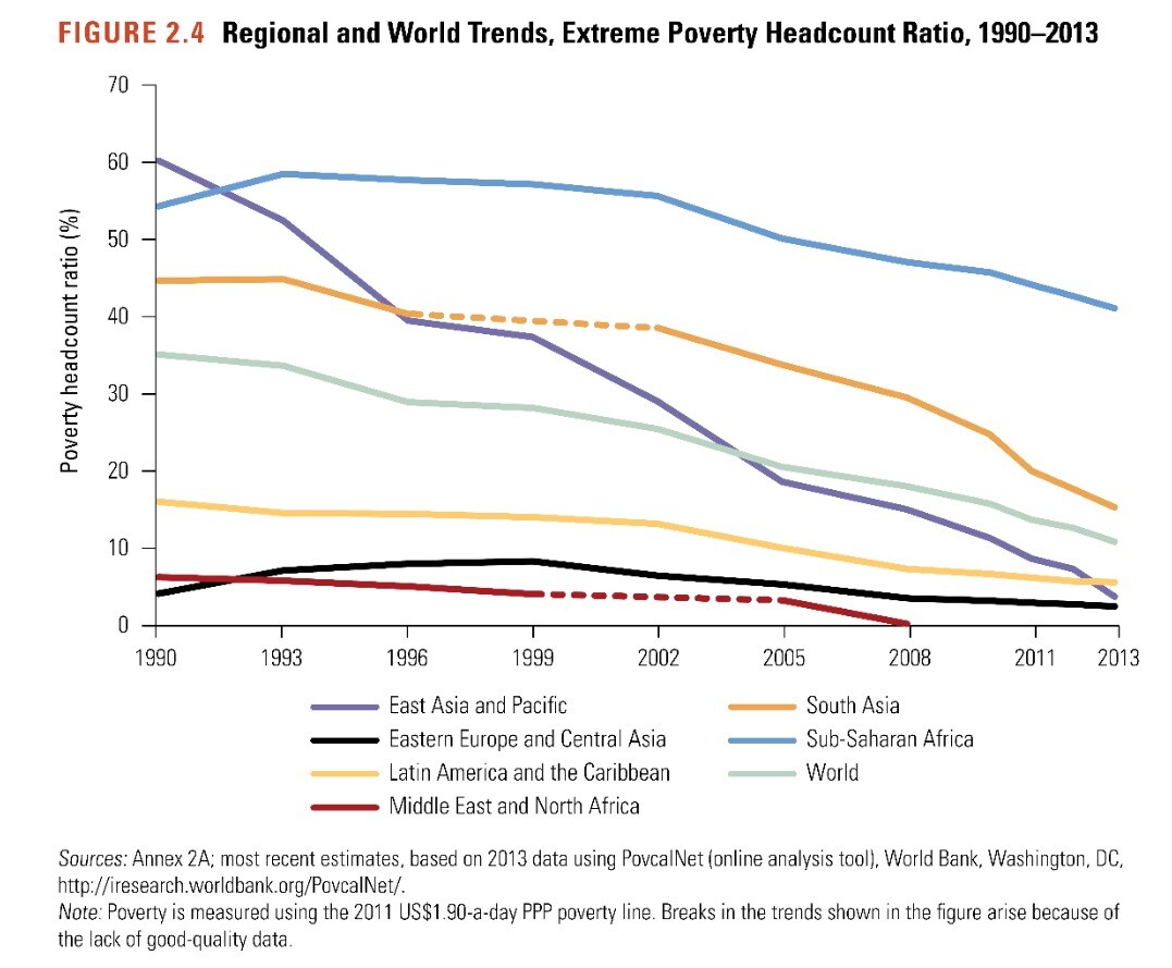 As more sophisticated commentators like Vox’s Dylan Matthews point out, just because people can’t afford the basic necessities of life, doesn’t mean their lives aren’t getting better (for instance, their incomes may have risen from 50¢ to $2 per day). In other words, just because we haven’t gotten close to alleviating extreme poverty doesn’t mean we haven’t made considerable progress in reducing the poverty gap
