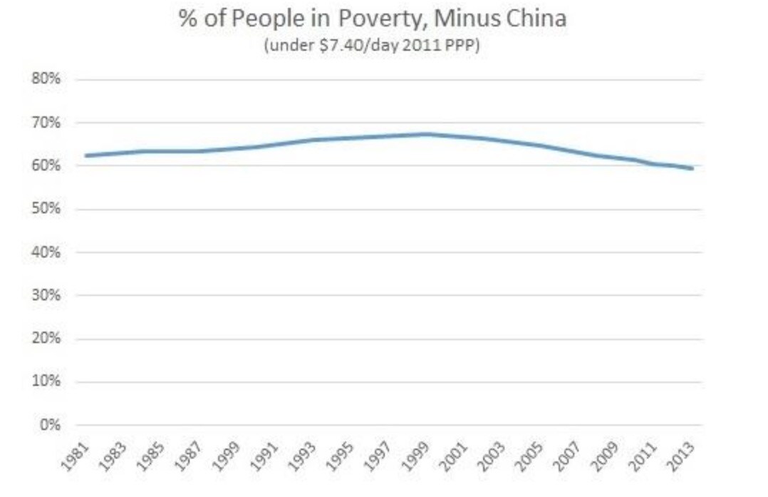 The impact of East Asia becomes even more obvious when looking at the $7.40 per day line. While looking at the world as a whole showed modest progress against poverty since 1981 (from 71 percent to 58 percent), as Jason Hickel has noted, the picture changes entirely when you take China out of the equation. Under the $7.40 per day line minus China, we find that over a billion people have been added to the ranks of the global poor and that the proportion of people in poverty has barely budged.[6]