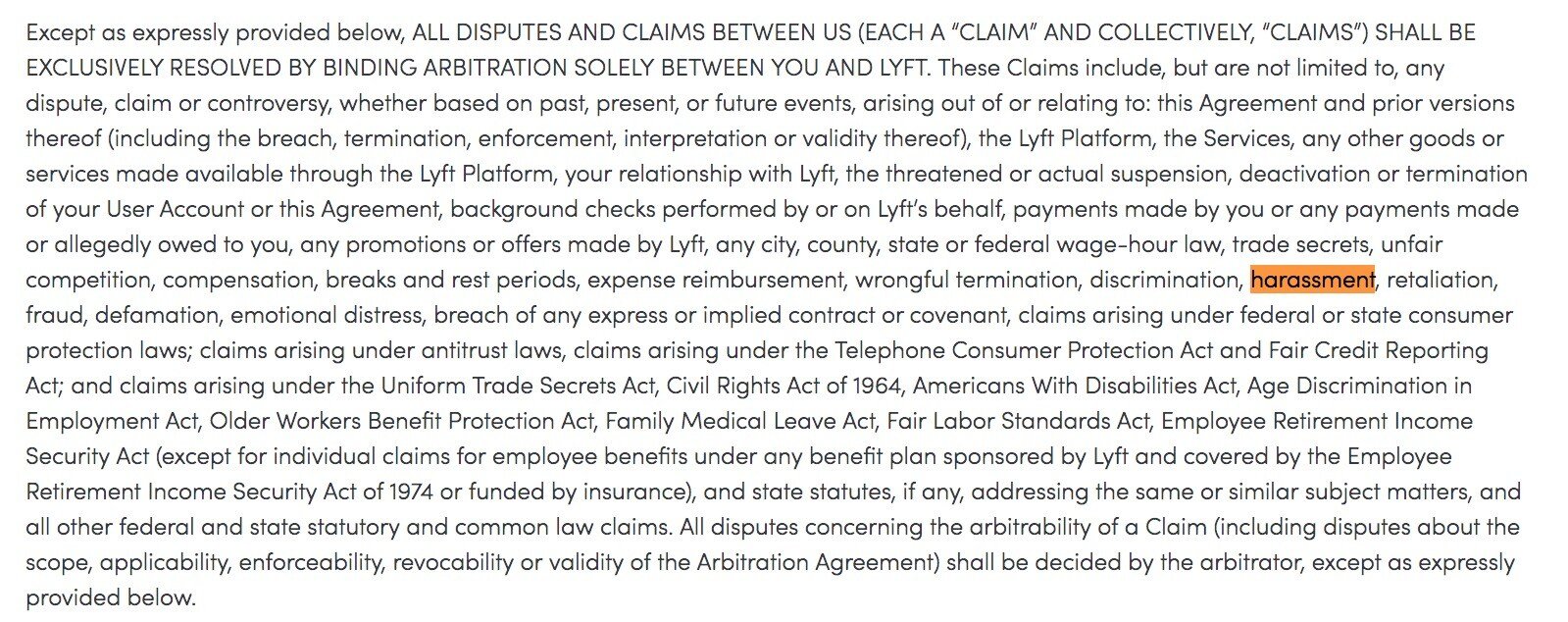 You can scroll through the rest on your own if you love pages and pages of legalese explaining, with as much obfuscation as possible, that you are waiving every meaningful right you have by using Lyft. You will not find any carve outs or exceptions for sexual harassment or sexual assault.