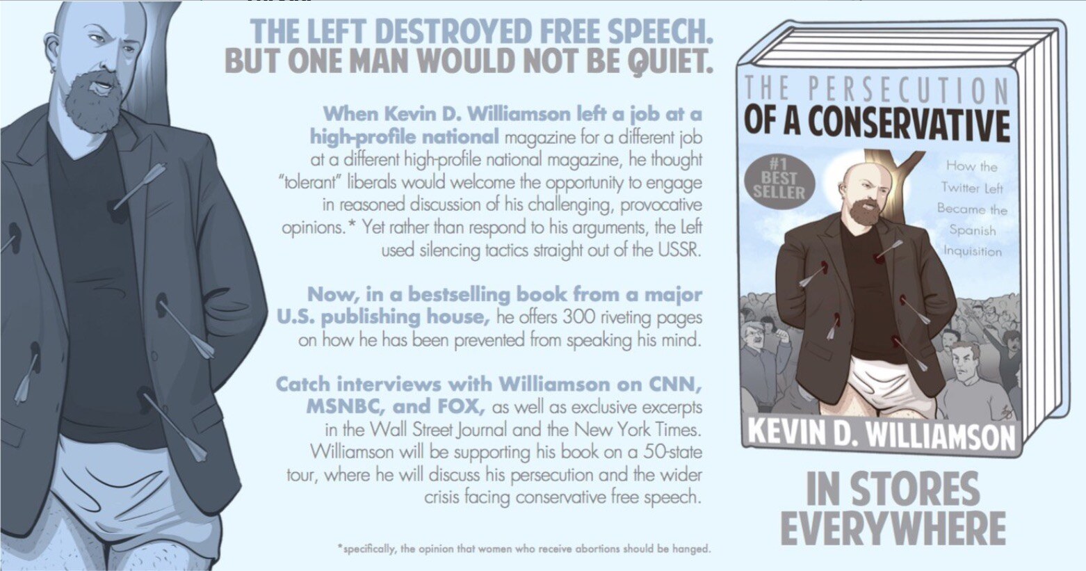 In our May-June 2018 issue, we ran a satirical advertisement for a book by National Review writer Kevin D. Williamson. The advertisement looked like this: