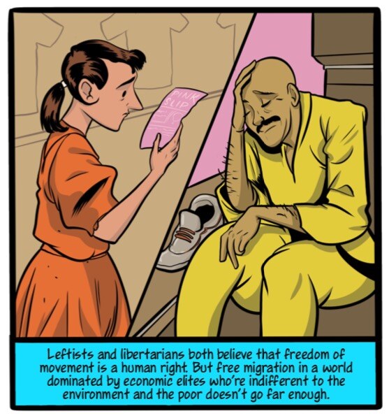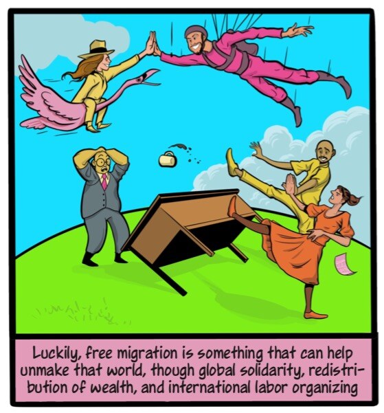 One thing that rich, successful people love to tell themselves is that they are rich because of their intelligence, their discipline, and their good habits. It’s a comfortable, self-reinforcing myth. Wealth proves virtue, and everyone else’s lack of wealth proves their lack of virtue. It’s much more comfortable than confronting the fact that vast wealth is accumulated, under the best of circumstances, via blind luck and more commonly by outright theft. The history of the United States and Mexico shows this clearly: The trajectories of our nations’ respective fortunes depended so heavily upon a contingent moment in history, where one nation took a rich territory that had previously belonged to another—a contingency that was then reinforced by many dozens, even hundreds, of additional contingencies, leading the United States to gradually view the hardening of the southern border as politically advantageous. A case for open borders that fails to reckon with past and present exploitation is necessarily going to feel like something between a Pollyanna pipe-dream and a smokescreen for further violent depredations. That’s not to say that Caplan’s arguments have no merit, or that there’s no common ground to be found between leftist and libertarian advocates for open borders. But—in the same way that Caplan’s comic book occasionally throws out a cautionary vision of a closed-borders world of tightly-sealed, totalitarian socialist states—leftist open borders advocates have a mirror nightmare vision, of a world homogenized and subjugated to the whims of the global rich, where people are free to move where they will, but their autonomy in each new place only increases by negligible fractions. If we believe that most countries in the world mistreat the poor, then allowing the poor to move from country to country only gets us so far. Open borders are not the solution to global injustice: They are simply a rectification of one injustice among many, creating the opportunity for a more fully international community to tackle other injustices wholesale.