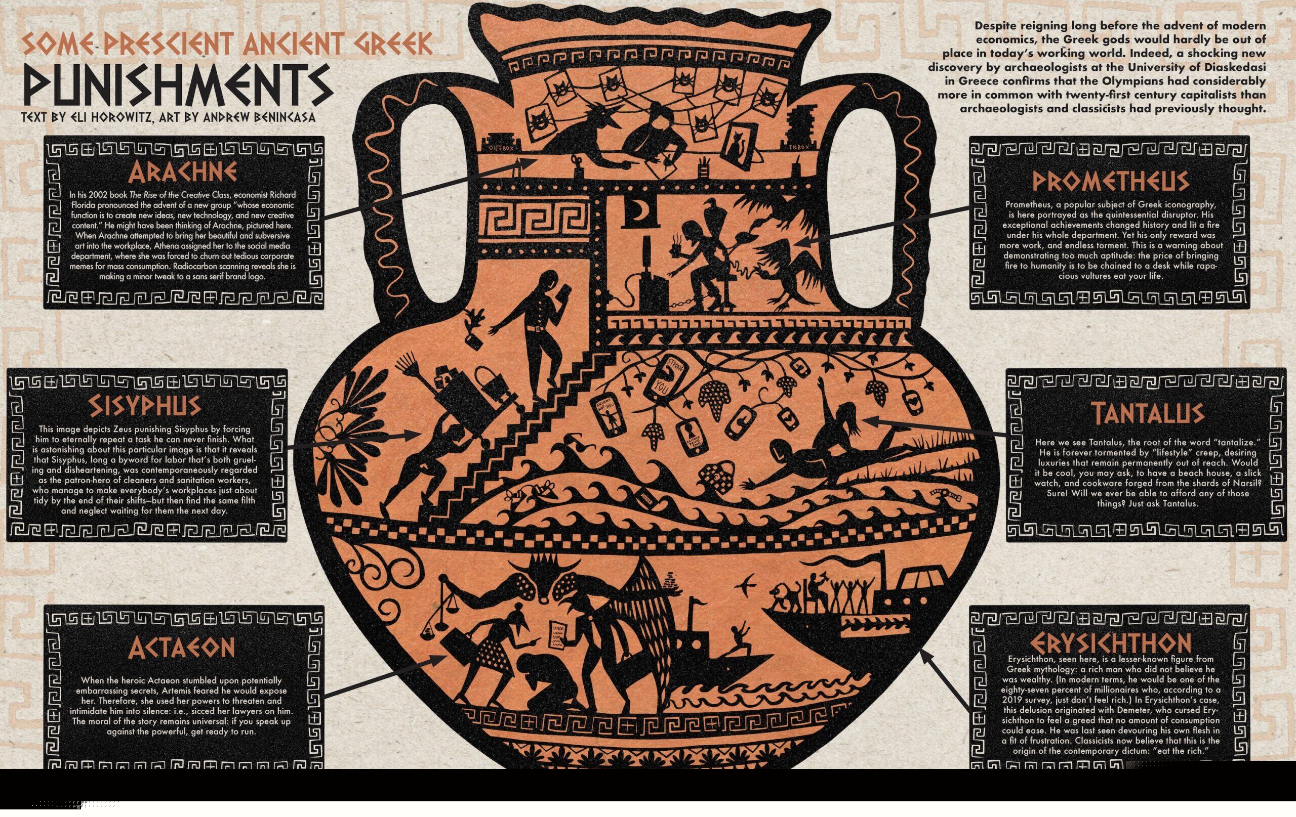 Erysichthon, seen here, is a lesser-known figure from Greek mythology: a rich man who did not believe he was wealthy. (In modern terms, he would be one of the eighty-seven percent of millionaires who, according to a 2019 survey, just don’t feel rich.) In Erysichthon’s case, this delusion originated with Demeter, who cursed Erysichthon to feel a greed that no amount of consumption could ease. He was last seen devouring his own flesh in a fit of frustration. Classicists now believe that this is the origin of the contemporary dictum: “eat the rich.”