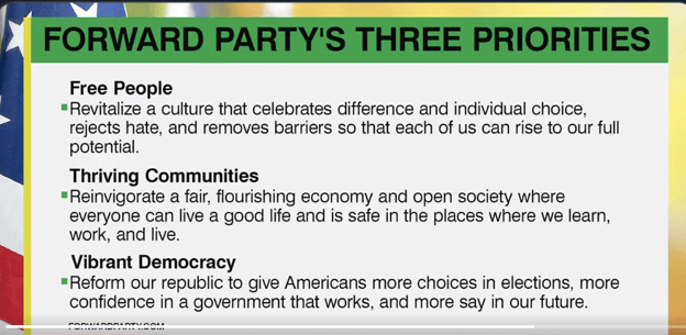 And then there’s the fact that the Party doesn’t seem to stand for anything in particular. The Forward Party’s Three ideological Priorities are “free people, thriving communities, and vibrant democracy.” But these declarations are so vague as to be essentially meaningless.
