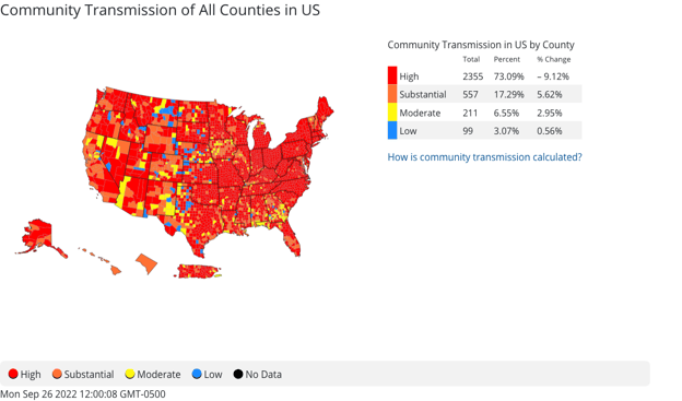 One week after Joe Biden declared that “the pandemic is over,” I finally contracted COVID-19. I had managed to avoid it up until now. I was careful. But I let my guard down and I got it. Although I can’t say for sure how I caught the virus—transmission levels of the virus are “high” for most parts of the country, according to the CDC, as in the image below—I did have contact with a person who had symptoms of a cold. “How could I be so stupid?” I thought to myself. Even though my contact only had a cold, it didn’t even cross my mind to ask them to get tested for COVID. A year ago, there was no way I would have come in the vicinity of a sick person without being masked and making sure they’d been tested. But I’d just stopped thinking about it, and so I didn’t take the obvious, easy steps that could have kept me from getting it.