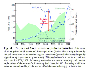 Those “others” include the far-flung poor who are at the mercy of global markets, where an “undue burden” can be deadly. As research by Yaneer Bar-Yam of the New England Complex Systems Institute has shown, world grain inventories increased by 140 million metric tons from September 2007 to September 2010. That’s enough to feed 440 million people for a year, but Bar-Yam concludes, the main reason that grain was not purchased and eaten was “due to speculation” (the rightmost green peak shows storage was increased as prices were rising, i.e., hoarding).