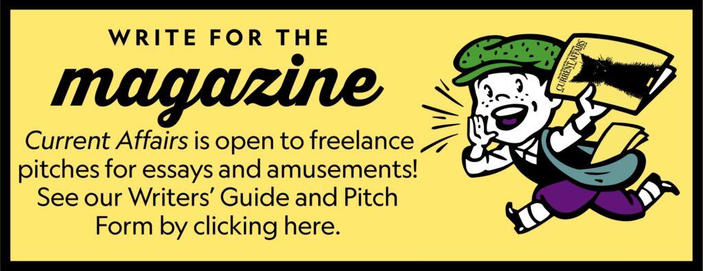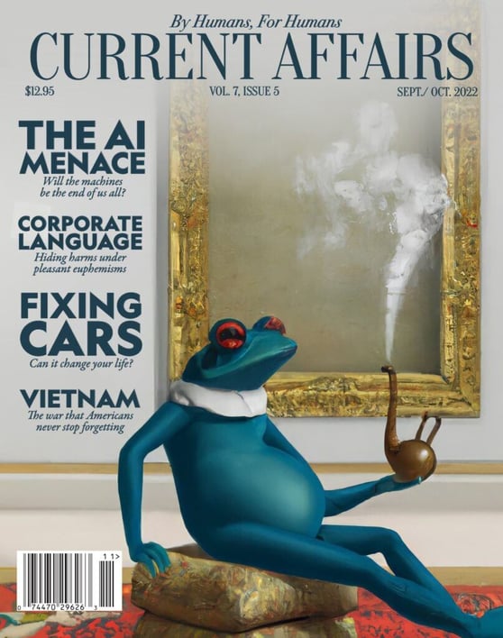 I had to work hard on it because there were a lot of things the image generator didn’t get right (especially the frog’s hand), and I’m proud of the result. But I didn’t paint it. And it did make me think: some places are going to use these new technologies to automate jobs that were done by hand. How do we make sure Current Affairs is ethical in any use of automation? I realized, however, that automation mainly presents an ethical problem for for-profit entities, which have an institutional mandate to cut labor costs when possible. For us, a not-for-profit entity, any money that automation saves can simply be given back to the workforce. Computer assistance can actually help us boost the pay of artists, by allowing them to make things faster. If Current Affairs presently pays a designer $300 for a page and it takes them four hours to design, but then a software allows them to make the same page in ten minutes, we can still pay them $300, even if for-profit entities are trying to drive down the prices they pay. I think our responsibility as the century unfolds is not to say that we won’t embrace new technologies, but to say that we won’t ever use new technologies to cut the share of our revenue that goes to labor.
