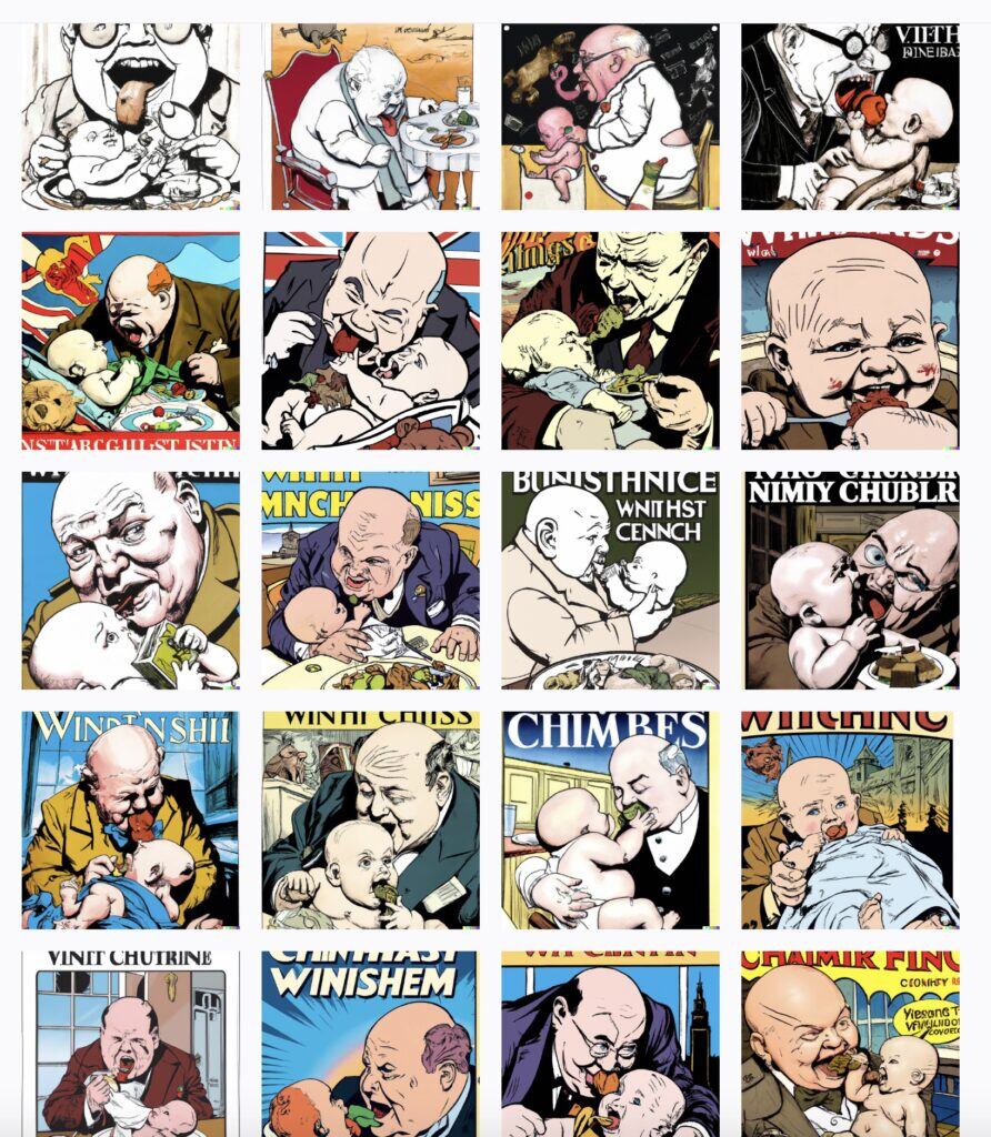 But my favorite silly prompt so far has been “a comic book cover of Winston Churchill eating a baby for dinner”: