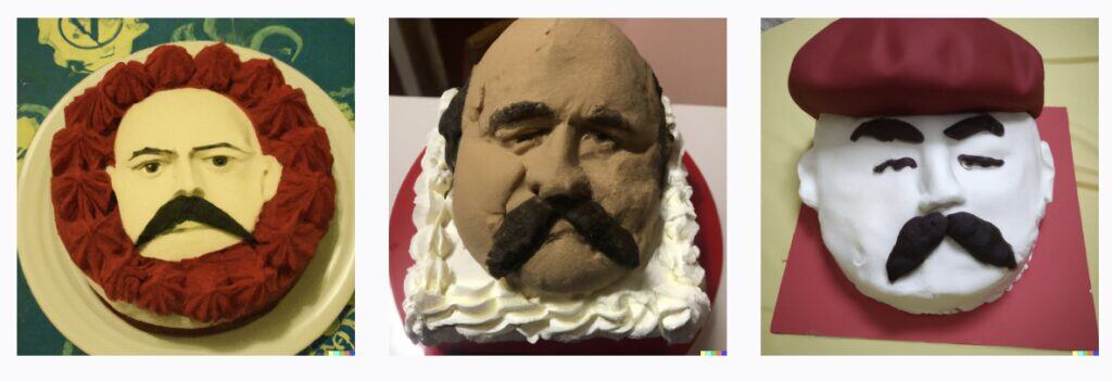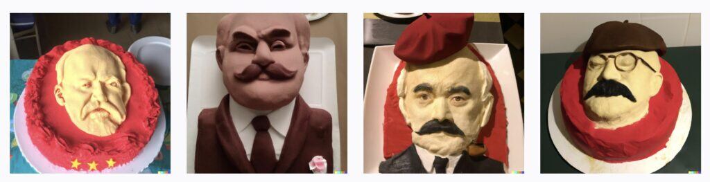 But perhaps this was too simple. Anyone can draw and paint beautiful watercolor illustrations of bears in trenchcoats. How about we ask it for “a cake that looks like Lenin”?