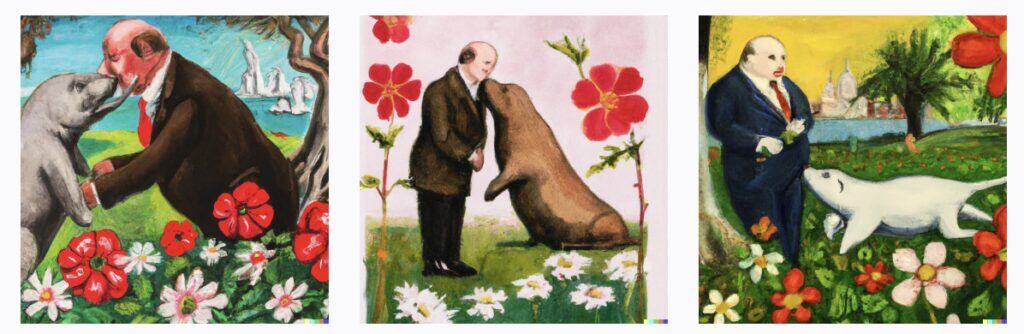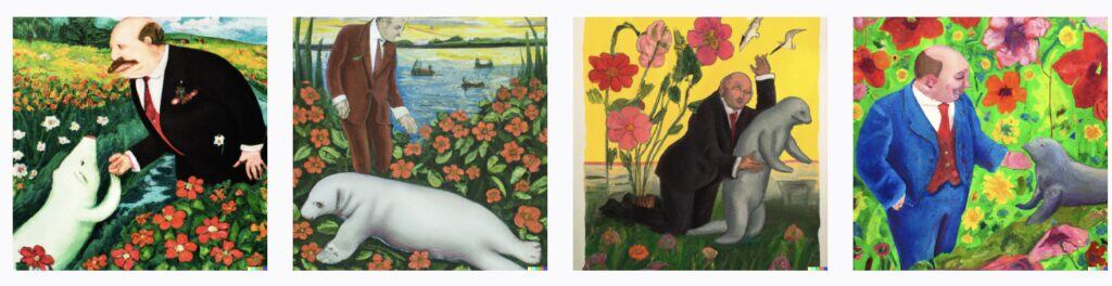 Okay, one of those might be Stalin, but still not too bad. As it turns out, I really like Lenin prompts. (Most humans are blocked by the content-filter from being depicted, for the obvious reason that the software would immediately be used to make compromising photos of celebrities, but I’ve found that Lenin and Winston Churchill somehow escape the filter.) Here are a few created in response to “a painting of Lenin marrying a manatee in a grove of flowers.”