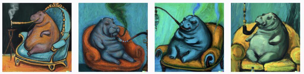 As you can see, these men do not look too much like Lenin, but the AI does realize that Lenin is bald and wears a suit. It also knows what flowers are, and kind of what a manatee looks like, although it seems to think a manatee has legs, which also appear in response to “a painting of a manatee in an armchair smoking a hookah”: