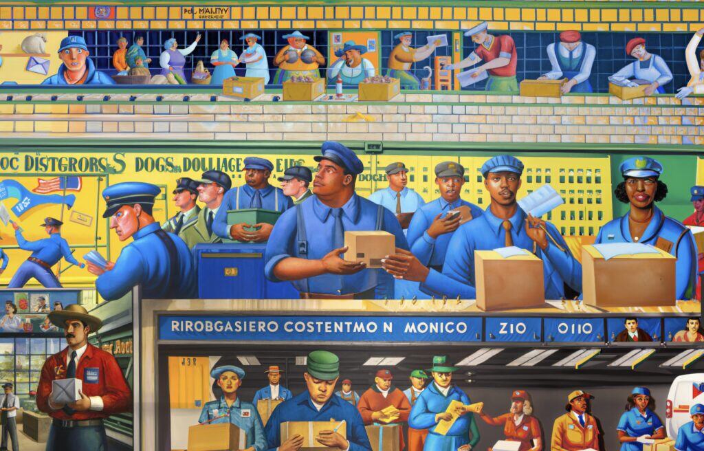 DALL-E has an extraordinary ability to mimic the styles of real artists. For instance, here I asked it to produce a Diego Rivera mural paying tribute to the work of the United States Postal Service: